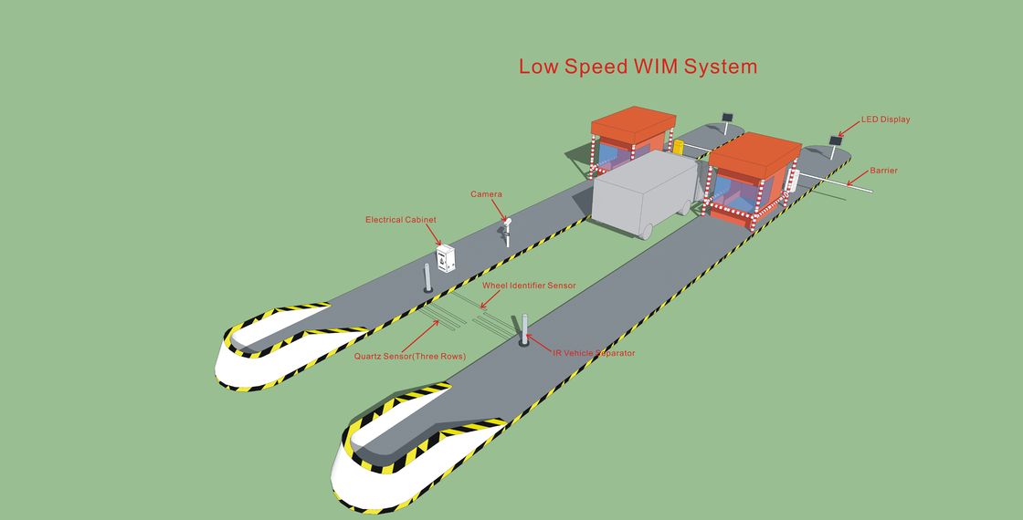 저속도 WIM 시스템은 소프트웨어를 포함한 설치된 센서와 전자 기구 단체를 언급하고, 시간을 통해서 동적 타이어 힘과 차량을 측정해서 사용되고 차바퀴 무게의 계산, 축 하중, 전체를 산정하는 동적 타이어 힘과 이동 차량의 부분적 중량을 측정하고 분석함으로써의, 속도, 차축 거리와) 같은 전체 중량을 제공합니다 ; 주로 고속도로와 다른 고속도로, 항구와 물류 유통 센터에 해당되었습니다.